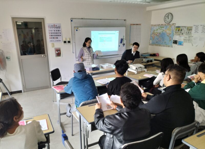 新入生たちは、船橋市外国人総合窓口発行のパンフレット『在留資格別生活マニュアル 船橋版』を手に、教職員の説明を真剣に聞いていました。
