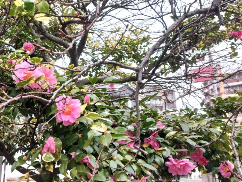 近隣に咲く薄ピンクのサザンカが寒空に映えています。